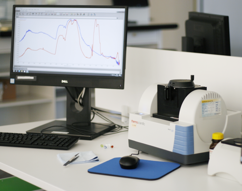 Lo Spettrometro FTIR, dotato di Sfera di Riflettanza Diffusa e Beam Condenser, è impiegato per distinguere gemme sintetiche da quelle naturali e per verificare la presenza di alcuni trattamenti, come il riempimento delle gemme con filler orgarnici e il trattamento termico dei corindoni.